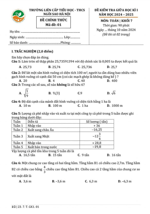 Đề Thi Giữa HK1 Toán 7 Đề giữa học kì 1 Toán 7 năm 2024 – 2025 trường TH&THCS Ngôi Sao Hà Nội 14/10/2024