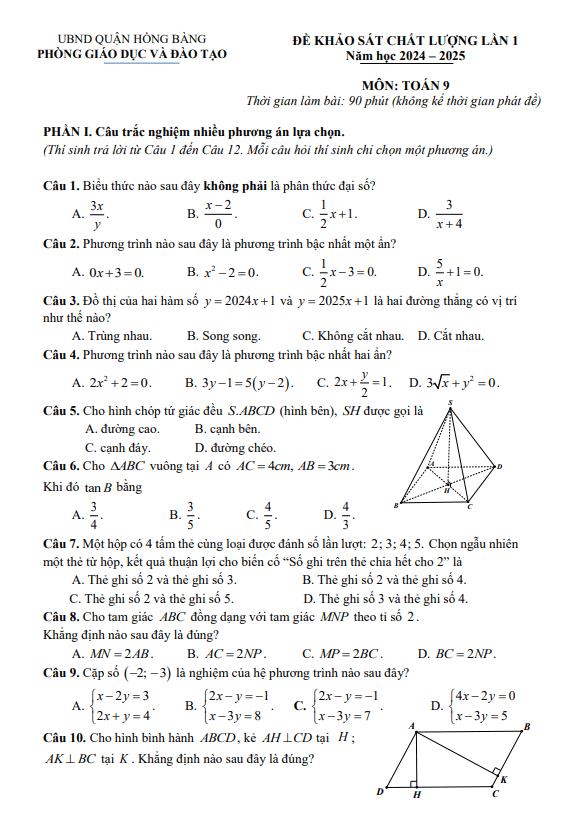 Khảo Sát Chất Lượng Toán 9 Đề khảo sát lần 1 Toán 9 năm 2024 – 2025 phòng GD&ĐT Hồng Bàng – Hải Phòng 10/10/2024