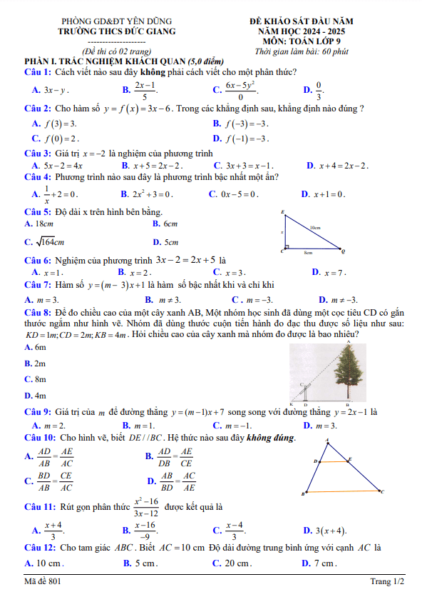 Khảo Sát Chất Lượng Toán 9 Đề khảo sát Toán 9 đầu năm 2024 – 2025 trường THCS Đức Giang – Bắc Giang 10/10/2024