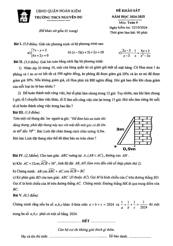 Khảo Sát Chất Lượng Toán 9 Đề khảo sát Toán 9 năm 2024 – 2025 trường THCS Nguyễn Du – Hà Nội 12/10/2024