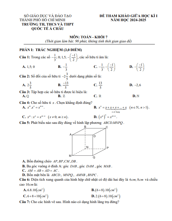 Đề Thi Giữa HK1 Toán 7 Đề tham khảo giữa kì 1 Toán 7 năm 2024 – 2025 phòng GD&ĐT Quận 3 – TP HCM 10/10/2024