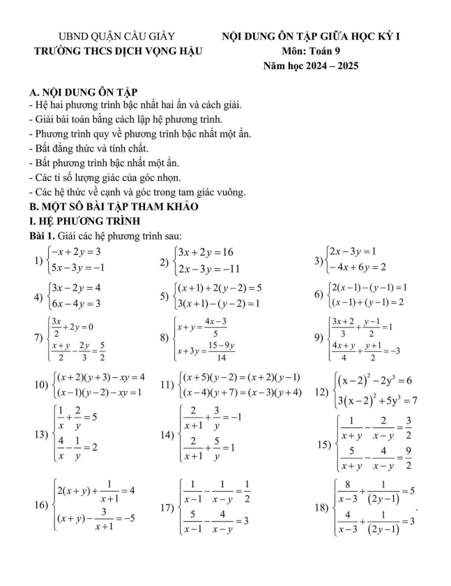 Đề Cương Ôn Tập Toán 9 Ôn tập giữa học kỳ 1 Toán 9 năm 2024 – 2025 trường THCS Dịch Vọng Hậu – Hà Nội 11/10/2024