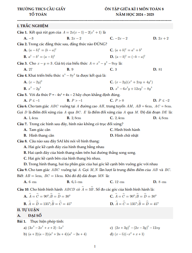 Đề Cương Ôn Tập Toán 8 Ôn tập giữa kì 1 Toán 8 năm 2024 – 2025 trường THCS Cầu Giấy – Hà Nội 12/10/2024