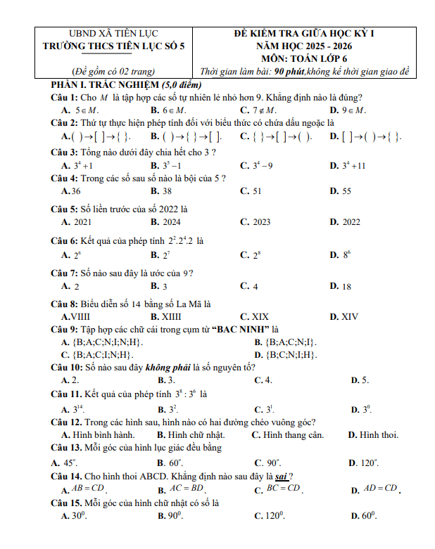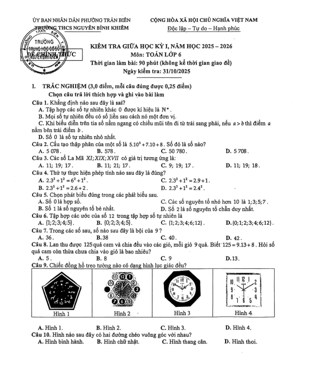 – Thời điểm kiểm tra: Kiểm tra giữa học kì 1 khi kết thúc nội dung: Tập hợp; cộng trừ nhân chia số tự nhiên; lũy thừa với số mũ tự nhiên; quan hệ chia hết; dấu hiệu chia hết cho 2, cho 5, cho 3, cho 9; số nguyên tố, hợp số; tam giác đều, hình vuông, lục giác đều; hình chữ nhật, hình thoi; hình bình hành.