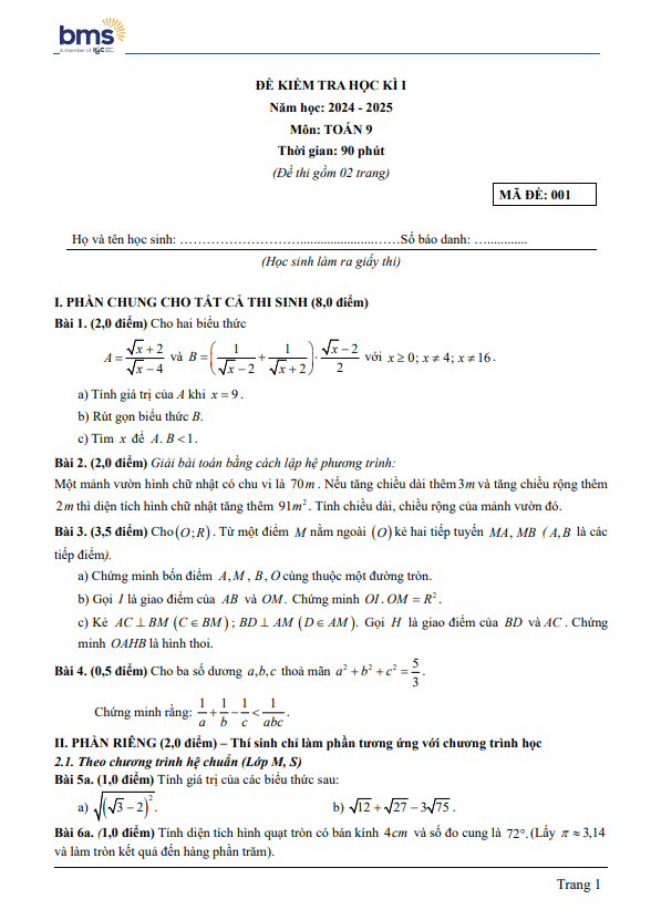 Khảo Sát Chất Lượng Toán 9 Đề khảo sát tháng 1 Toán 9 năm 2024 – 2025 phòng GD&ĐT Thanh Trì – Hà Nội 23/01/2025