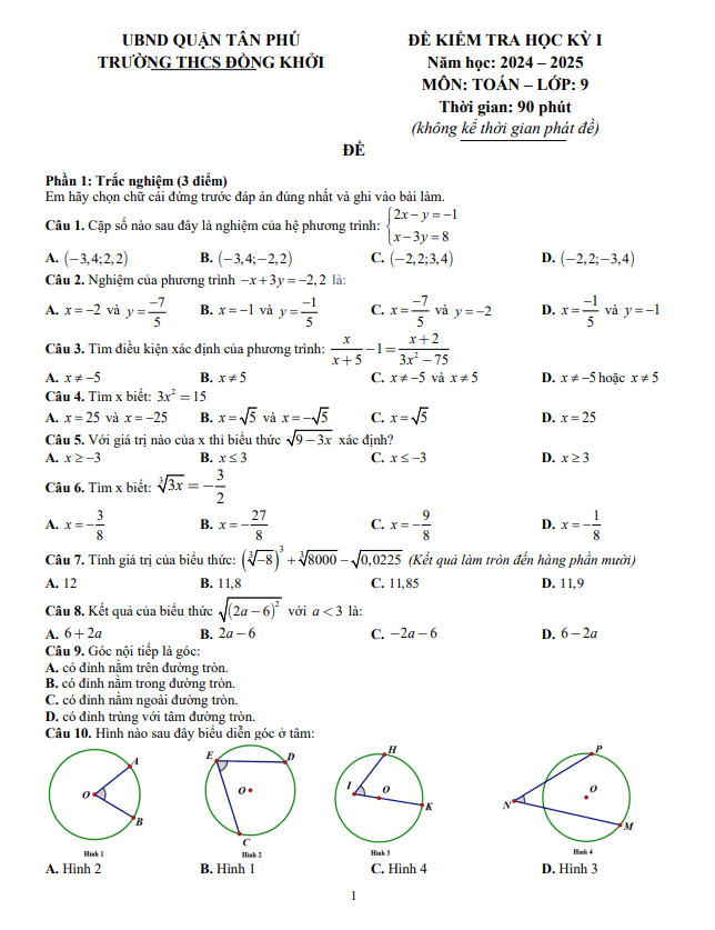 Đề Thi HK1 Toán 9 Đề cuối học kì 1 Toán 9 năm 2024 – 2025 phòng GD&ĐT Kim Thành – Hải Dương 05/01/2025