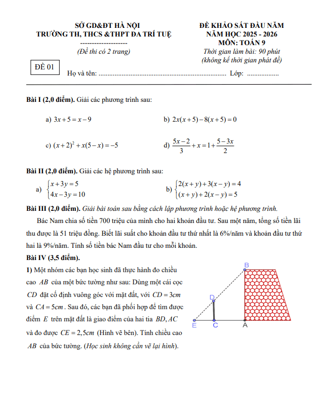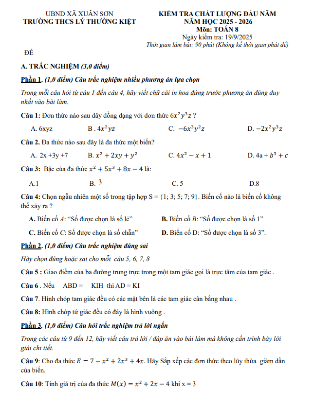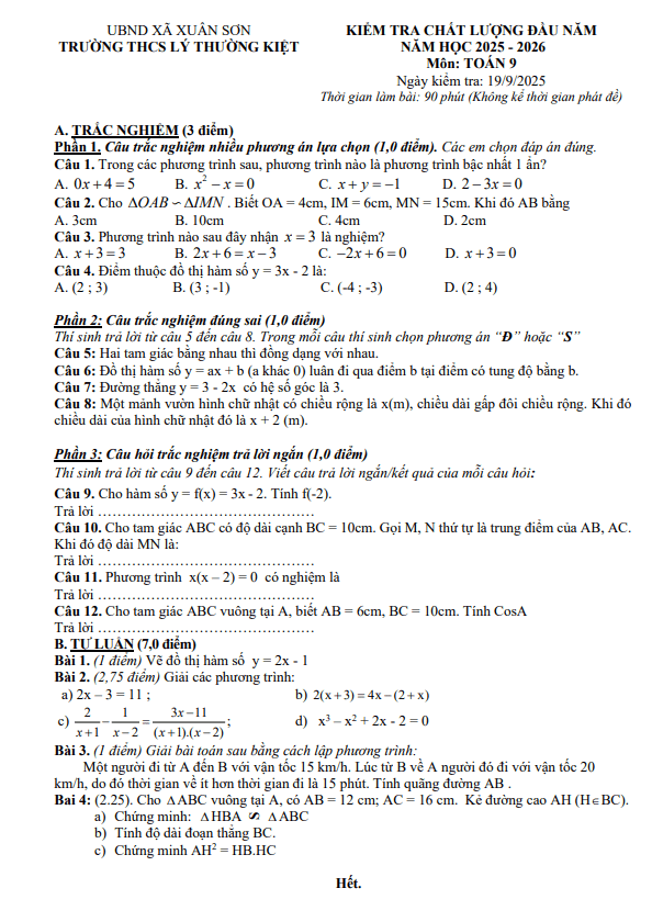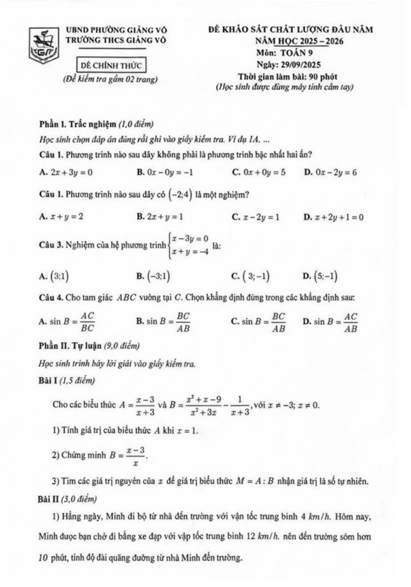 Trích dẫn Đề cuối kì 2 Toán 9 năm 2024 – 2025 trường THCS Đỗ Đăng Tuyển – Đà Nẵng: