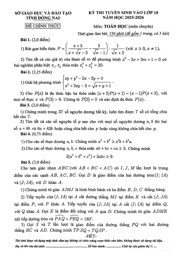 Đề Thi Tuyển Sinh Lớp 10 Môn Toán Đề tuyển sinh lớp 10 môn Toán (chuyên) năm 2025 – 2026 sở GD&ĐT Đồng Nai 31/05/2025
