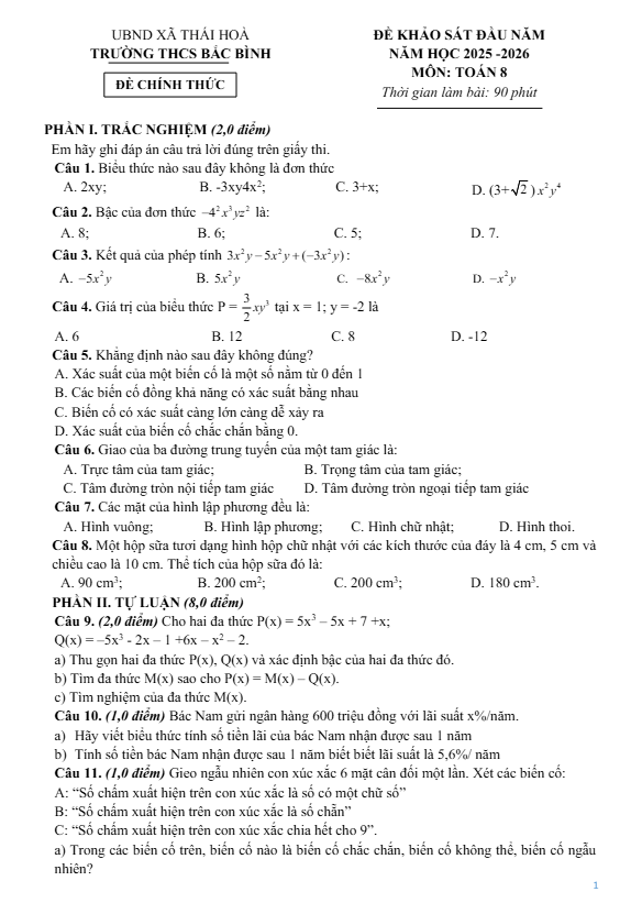 Đề tuyển sinh lớp 10 môn Toán năm 2025 – 2026 sở GD&ĐT Bắc Ninh