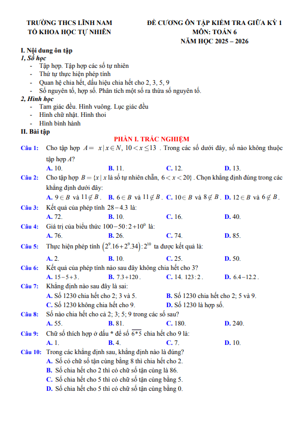 THCS.TOANMATH.com giới thiệu đến quý thầy, cô giáo và các em học sinh đề cương ôn tập kiểm tra giữa học kỳ 1 môn Toán 6 năm học 2025 – 2026 trường THCS Thành Công, phường Giảng Võ, thành phố Hà Nội.