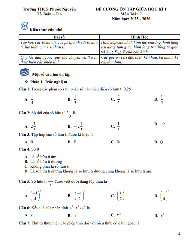 Đề cương giữa học kì 1 Toán 7 năm 2025 – 2026 trường THCS Phước Nguyên – TP HCM