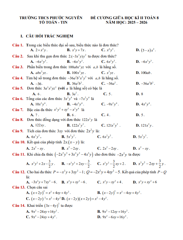 Đề cương giữa học kì 1 Toán 8 năm 2025 – 2026 trường THCS Phước Nguyên – TP HCM