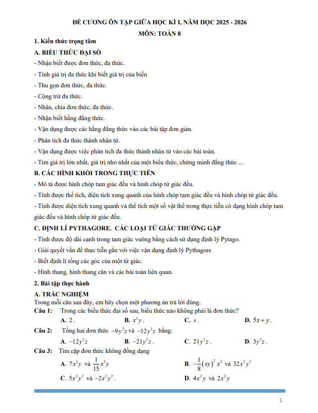 Đề cương giữa kì 1 Toán 8 năm 2025 – 2026 trường THCS Huỳnh Thúc Kháng – Đà Nẵng
