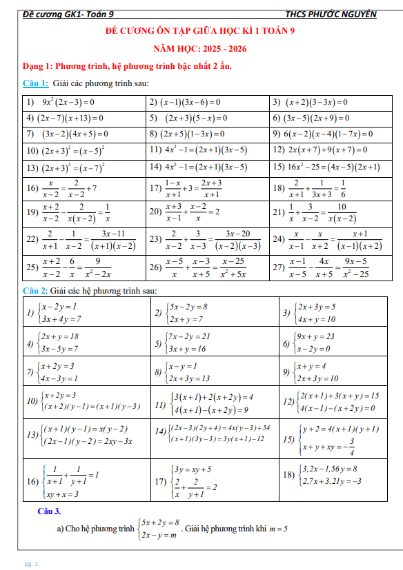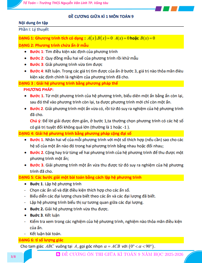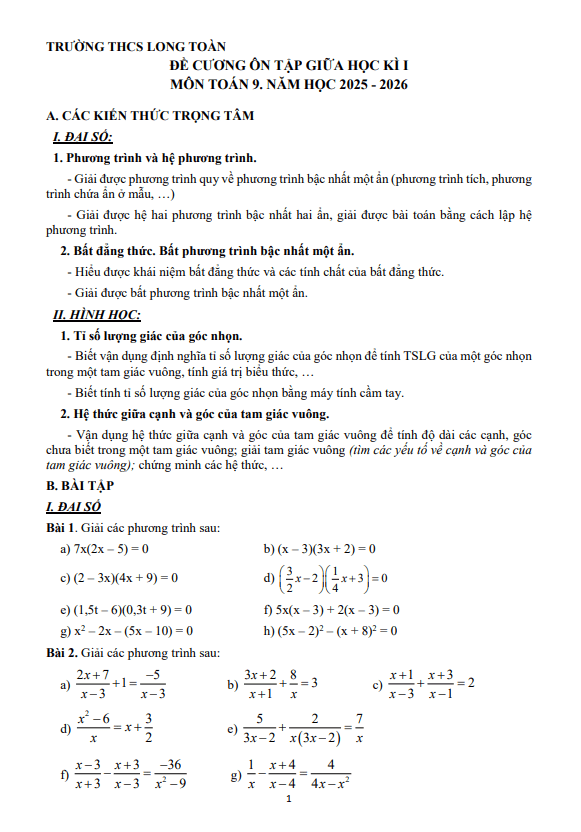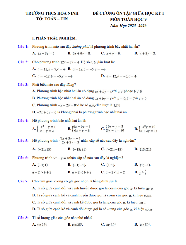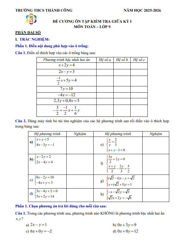 THCS.TOANMATH.com giới thiệu đến quý thầy, cô giáo và các em học sinh đề cương hướng dẫn ôn tập giữa học kỳ 1 môn Toán 9 năm học 2025 – 2026 trường THCS Chu Văn An, phường Tây Hồ, thành phố Hà Nội.