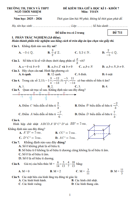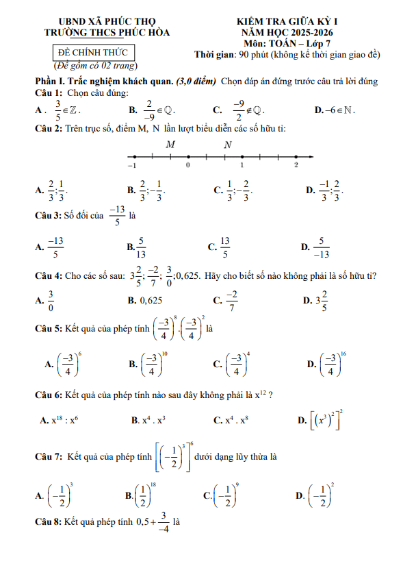 Đề giữa học kì 1 Toán 7 năm 2025 – 2026 trường THCS Phú Lợi – TP HCM