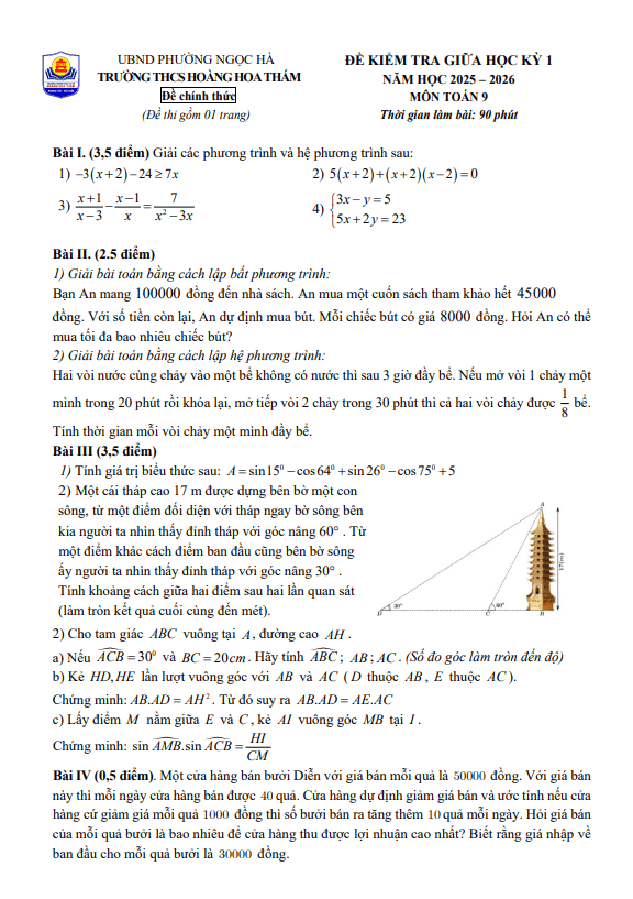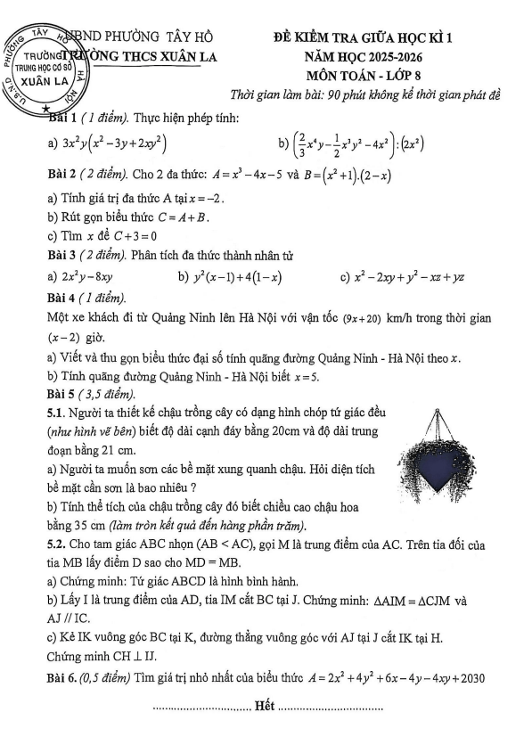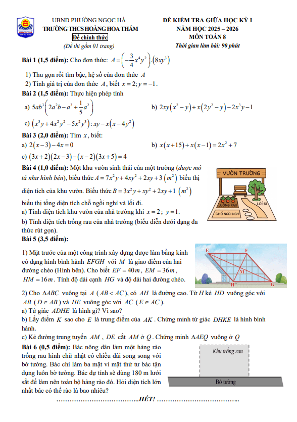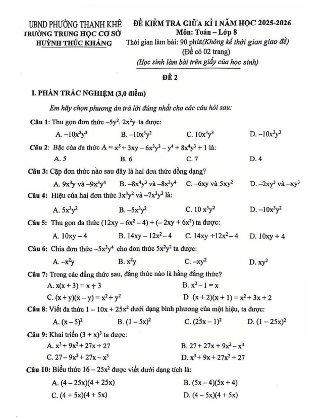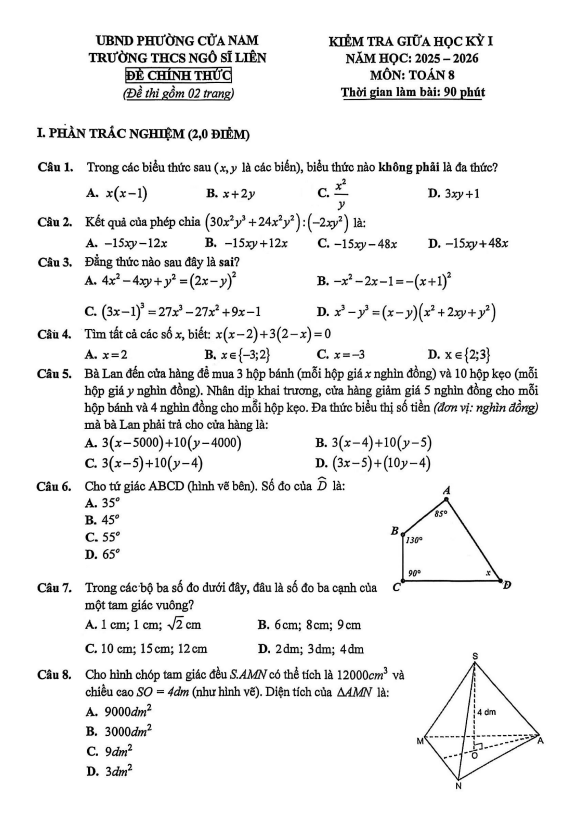 THCS.TOANMATH.com giới thiệu đến quý thầy, cô giáo và các em học sinh đề kiểm tra giữa học kì 1 môn Toán 8 năm học 2025 – 2026 trường THCS Phú Lợi, phường Bình Đông, thành phố Hồ Chí Minh. Đề thi có đáp án và hướng dẫn chấm điểm.
