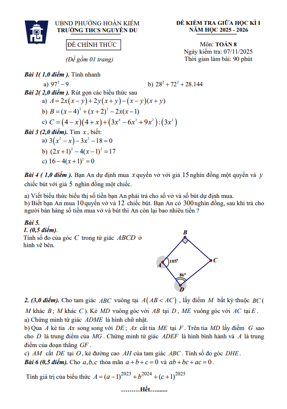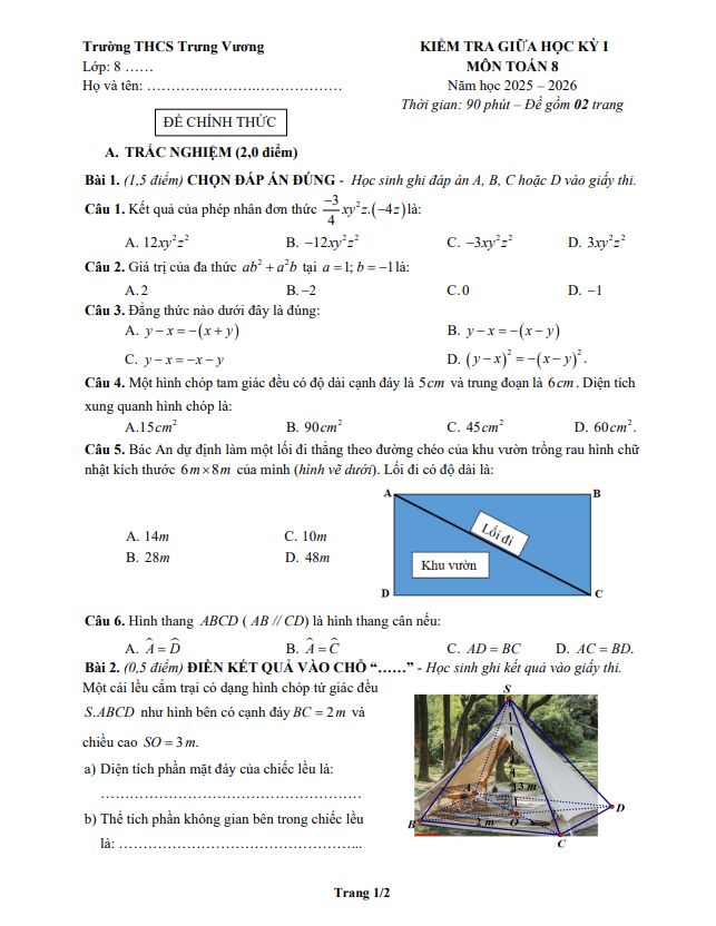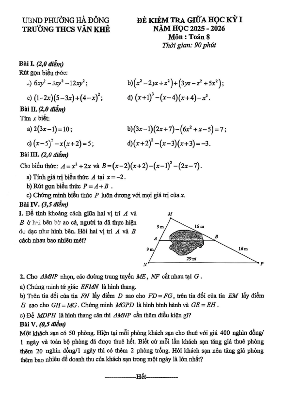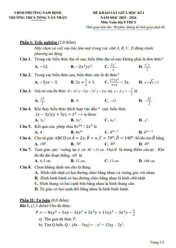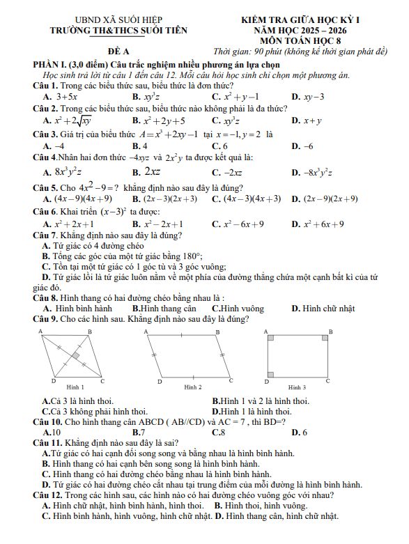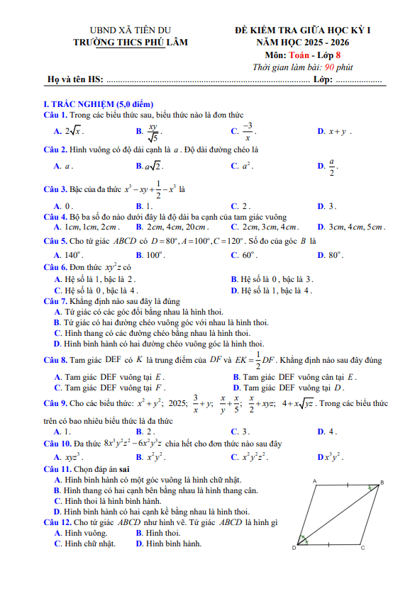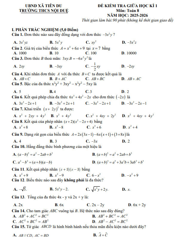 Đề giữa học kì 1 Toán 8 năm 2025 – 2026 trường THCS Tân Sỏi – Bắc Ninh