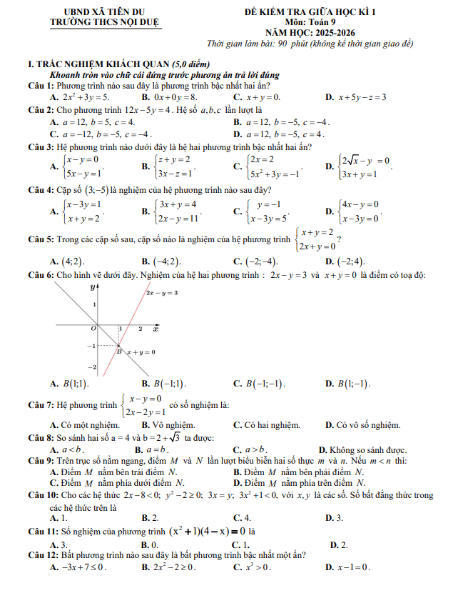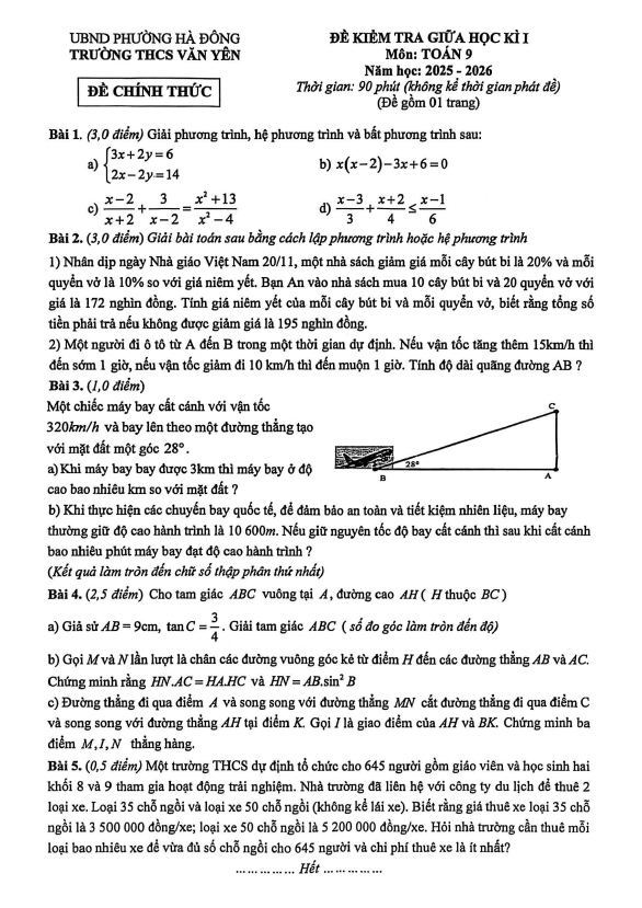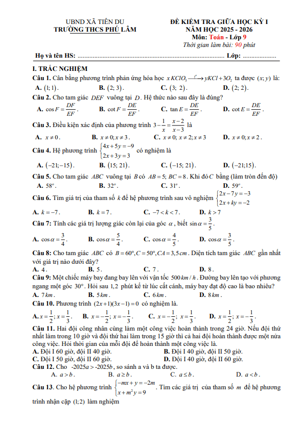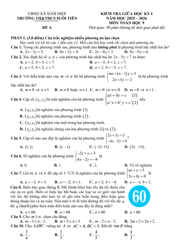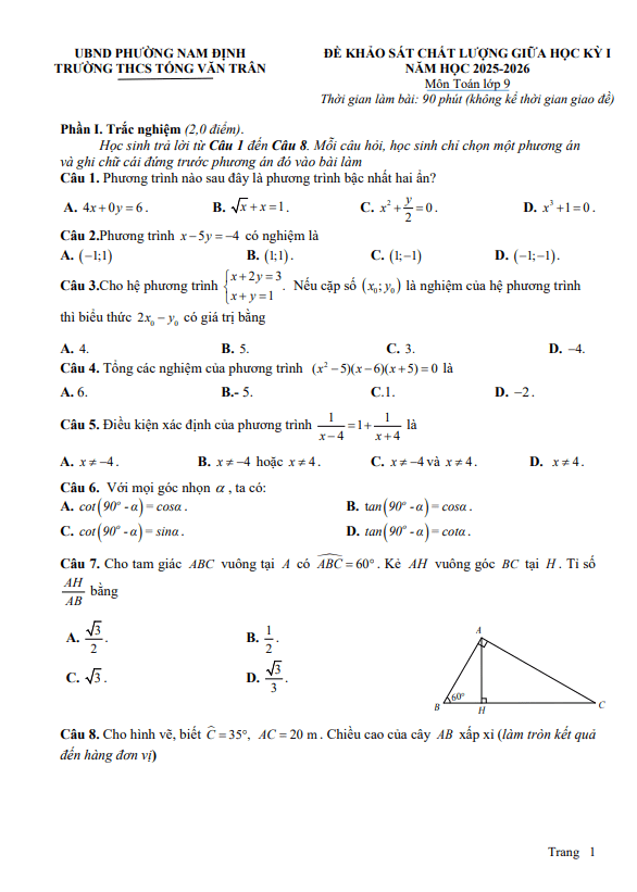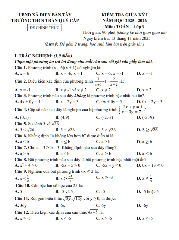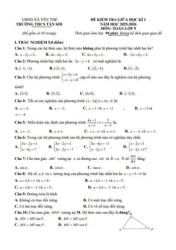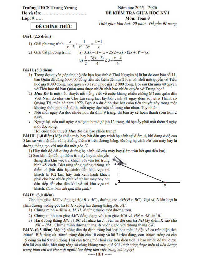 Trích dẫn Đề giữa học kỳ 1 Toán 9 năm 2025 – 2026 trường Thực hành Sài Gòn – TP HCM: