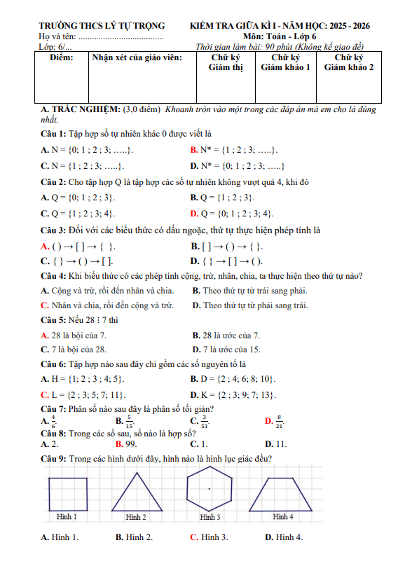 Đề Thi Giữa HK1 Toán 6 Đề giữa học kỳ 1 Toán 6 năm 2025 – 2026 trường THCS Lý Tự Trọng – Đà Nẵng 02/12/2025