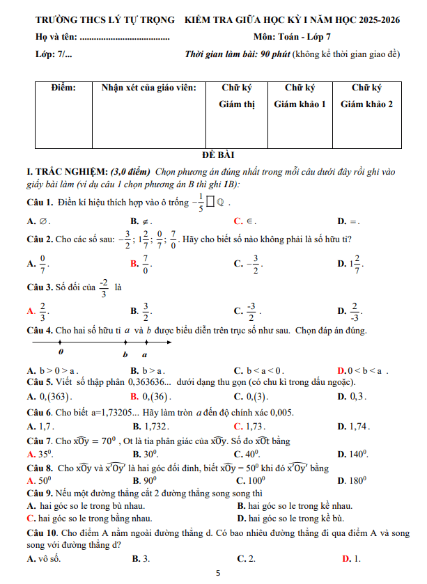 Đề Thi Giữa HK1 Toán 7 Đề giữa học kỳ 1 Toán 7 năm 2025 – 2026 trường THCS Lý Tự Trọng – Đà Nẵng 02/12/2025