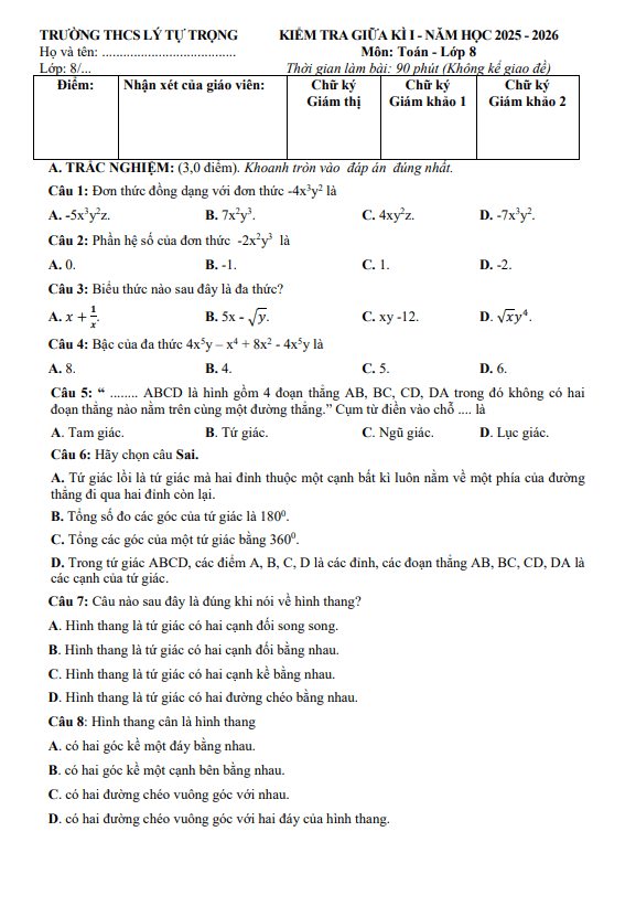 Đề Thi Giữa HK1 Toán 8 Đề giữa học kỳ 1 Toán 8 năm 2025 – 2026 trường THCS Lý Tự Trọng – Đà Nẵng 02/12/2025