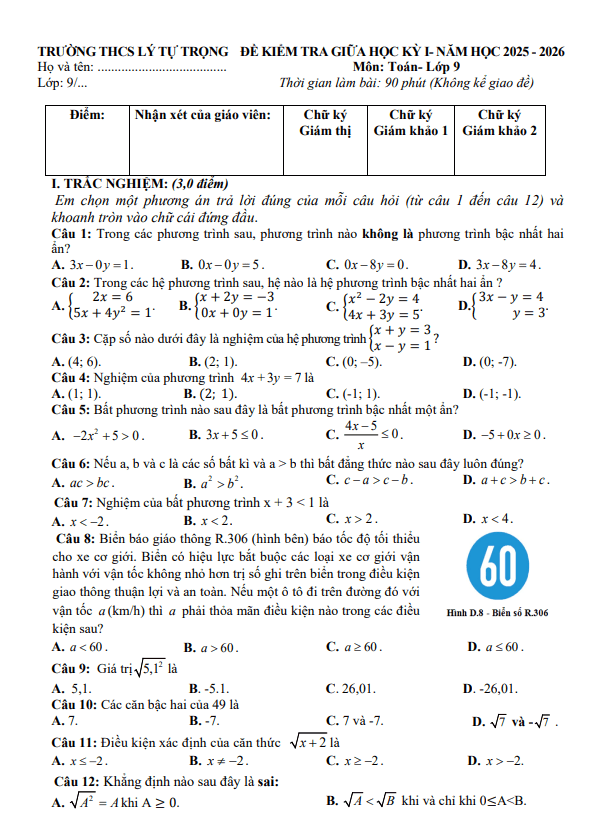 Đề Thi Giữa HK1 Toán 9 Đề giữa học kỳ 1 Toán 9 năm 2025 – 2026 trường THCS Lý Tự Trọng – Đà Nẵng 02/12/2025