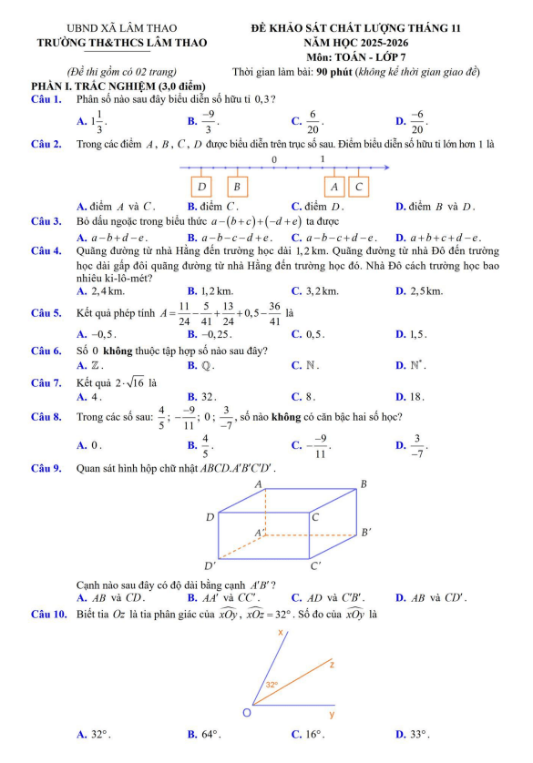 Khảo Sát Chất Lượng Toán 7 Đề khảo sát Toán 7 tháng 11 năm 2025 trường TH&THCS Lâm Thao – Bắc Ninh 01/12/2025