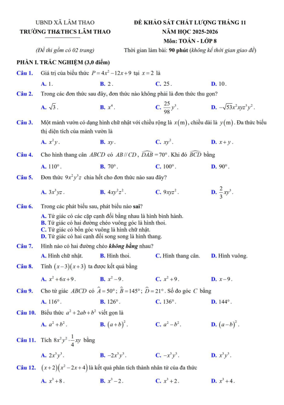 Khảo Sát Chất Lượng Toán 8 Đề khảo sát Toán 8 tháng 11 năm 2025 trường TH&THCS Lâm Thao – Bắc Ninh 01/12/2025