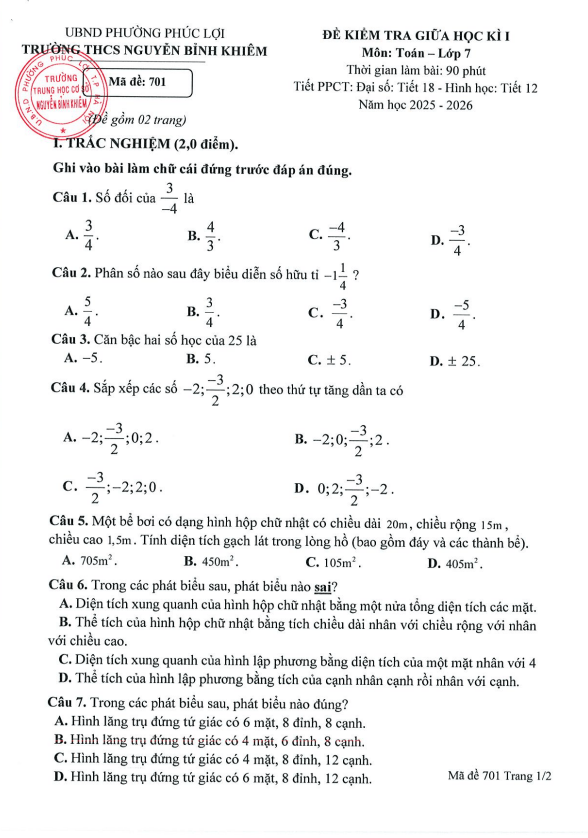 Ma trận Đề giữa học kỳ 1 Toán 7 năm 2025 – 2026 trường THCS Lý Tự Trọng – Đà Nẵng: