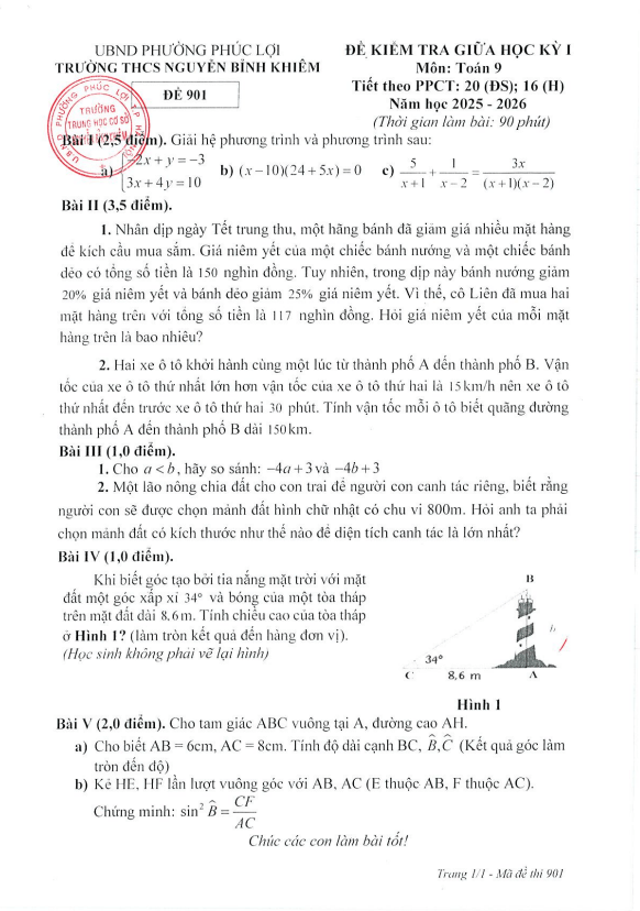 THCS.TOANMATH.com giới thiệu đến quý thầy, cô giáo và các em học sinh đề kiểm tra giữa học kỳ 1 môn Toán 9 năm học 2025 – 2026 trường THCS Lý Tự Trọng, thành phố Đà Nẵng. Đề thi có đáp án và hướng dẫn chấm điểm.