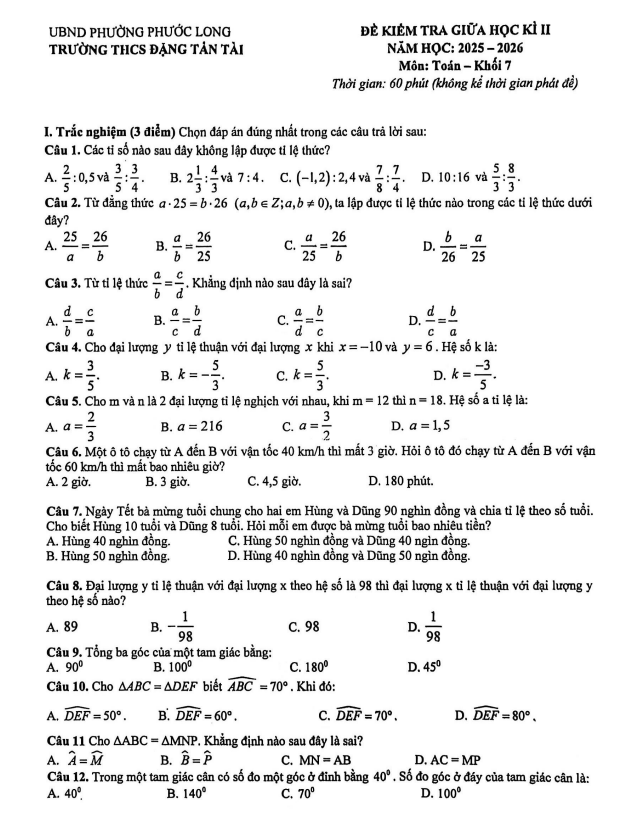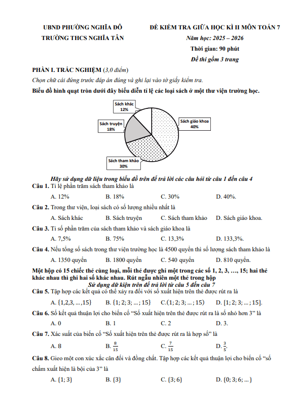 Trích dẫn Đề giữa học kỳ 2 Toán 7 năm 2025 – 2026 trường THCS Lý Tự Trọng – Phú Thọ:
