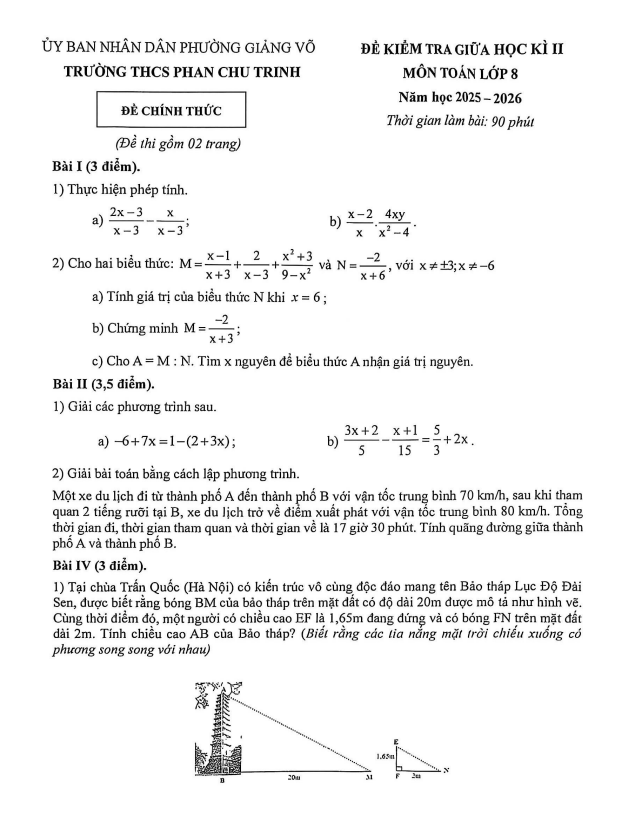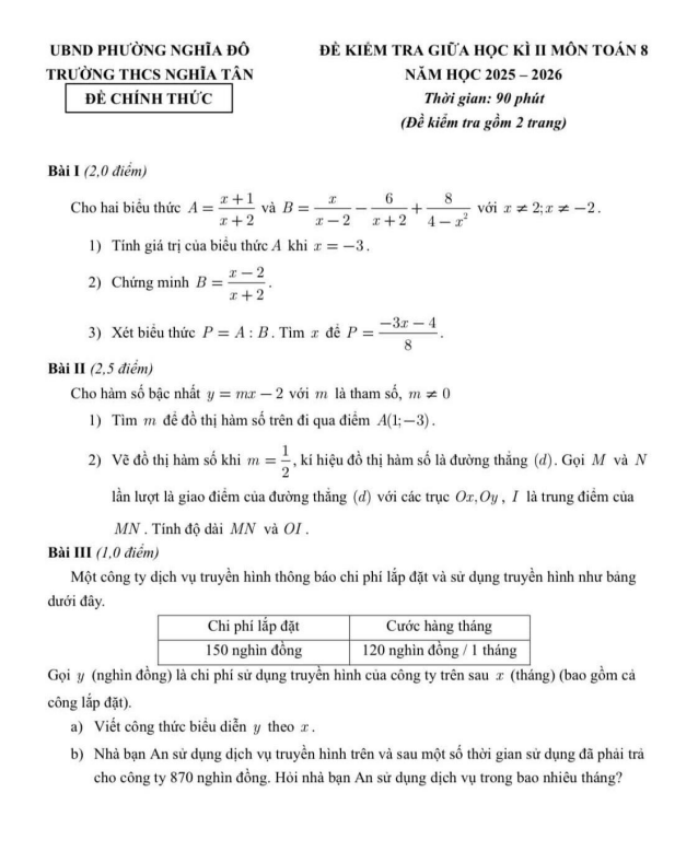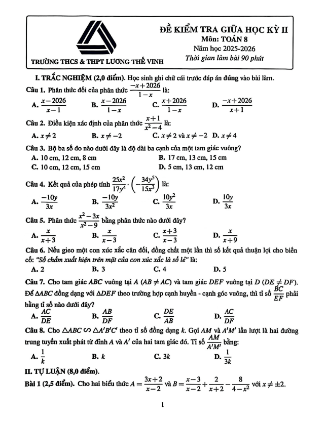 Nội dung Đề giữa kỳ 2 Toán 8 năm 2025 – 2026 trường THCS Quế Thuận – Đà Nẵng: