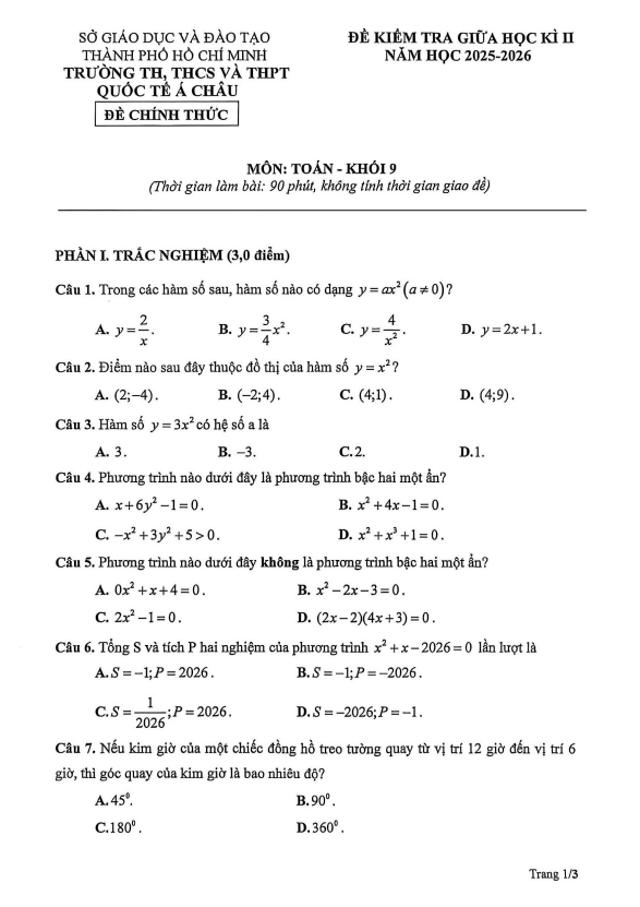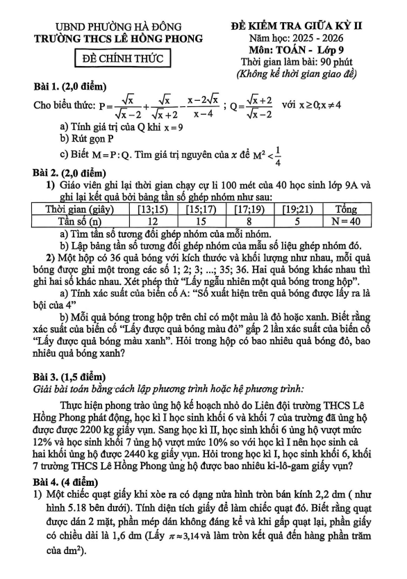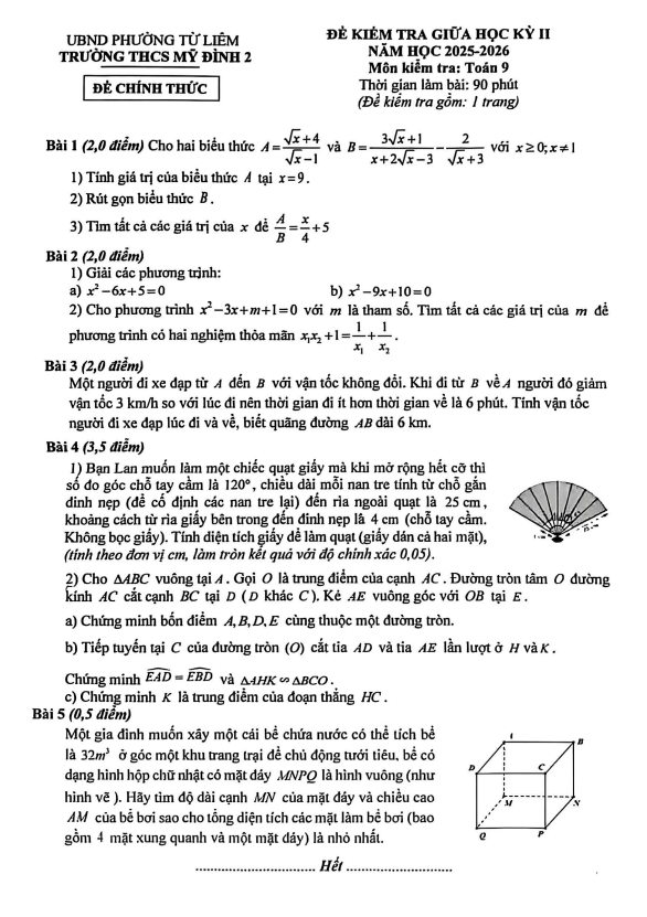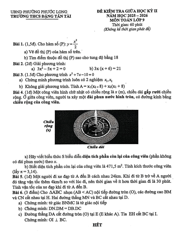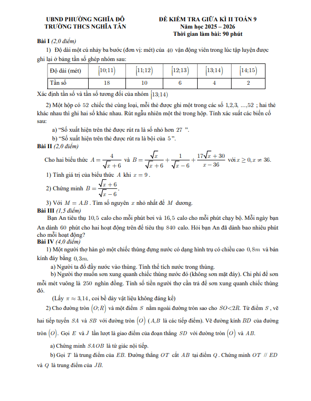 Nội dung Đề giữa kỳ 2 Toán 9 năm 2025 – 2026 trường THCS Quế Thuận – Đà Nẵng:
