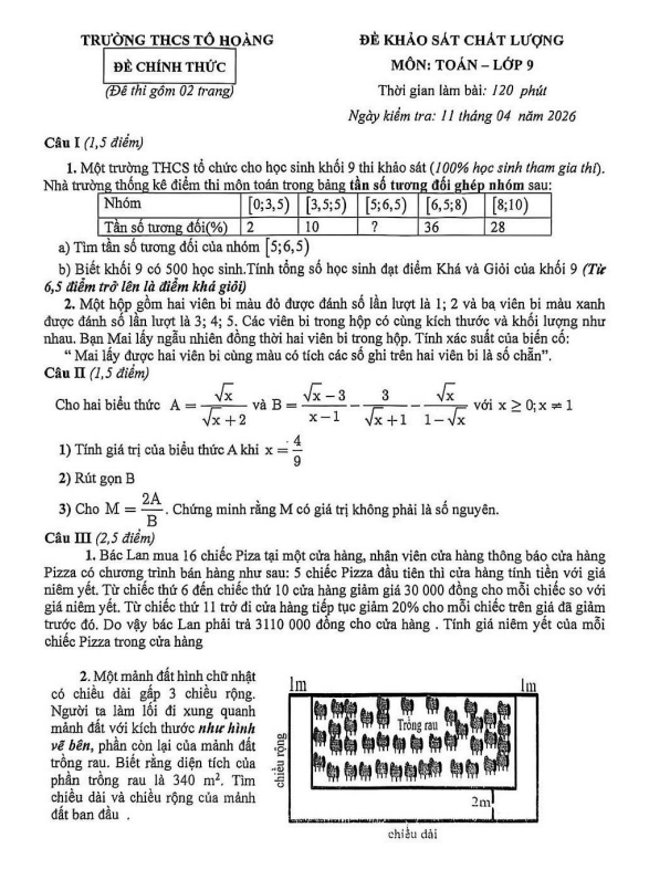 THCS.TOANMATH.com giới thiệu đến quý thầy, cô giáo và các em học sinh đề thi khảo sát chất lượng học sinh môn Toán 9 năm học 2025 – 2026 sở Giáo dục và Đào tạo tỉnh Hà Tĩnh. Đề thi hình thức 20% trắc nghiệm (08 câu) + 80% tự luận (06 câu), thời gian làm bài 90 phút, có đáp án và lời giải chi tiết. Kỳ thi được diễn ra vào ngày 15 tháng 04 năm 2026.