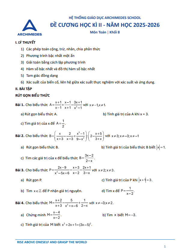 + Hình học: Định lý Thales, đường trung bình của tam giác, tính chất đường phân giác của tam giác, tam giác đồng dạng.