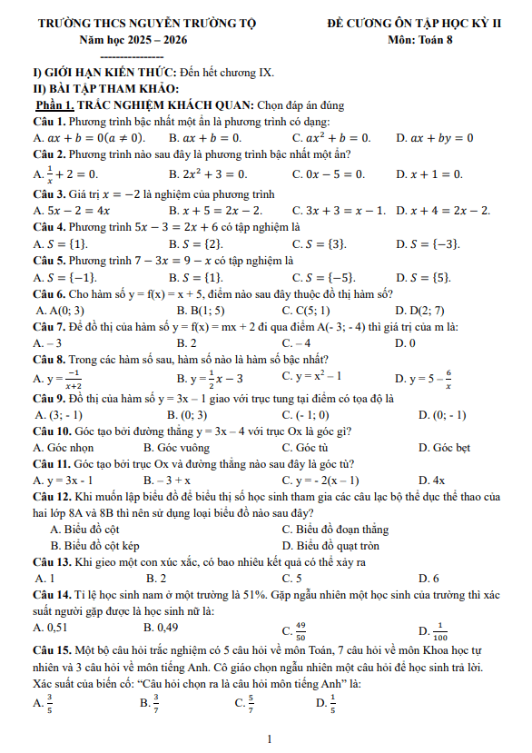 + Đại số: Thống kê và xác suất, phương trình bậc nhất một ẩn.