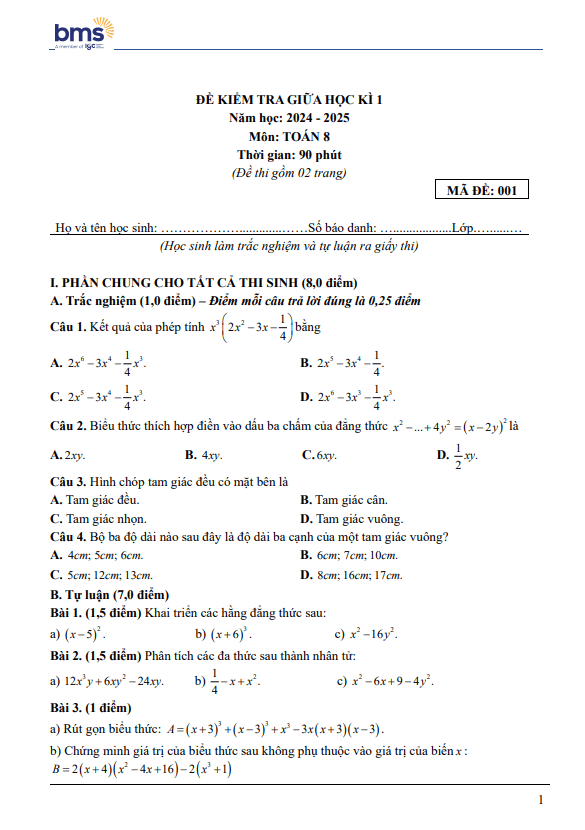 Đề Thi Giữa HK1 Toán 8 Đề giữa học kì 1 Toán 8 năm 2024 – 2025 trường Ban Mai School – Hà Nội 21/11/2024