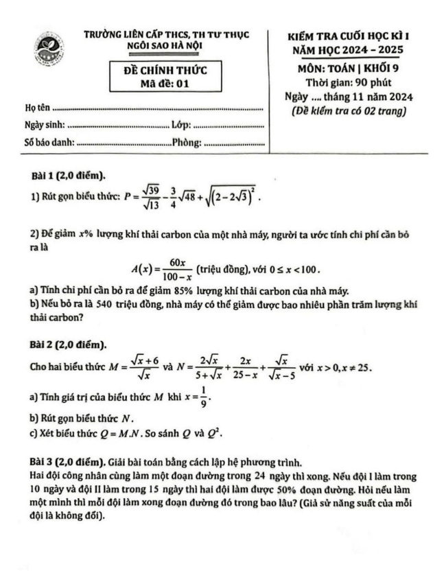 Đề Thi Giữa HK1 Toán 9 Đề giữa học kì 1 Toán 9 năm 2024 – 2025 trường THCS Phúc Lợi – Hà Nội 20/11/2024