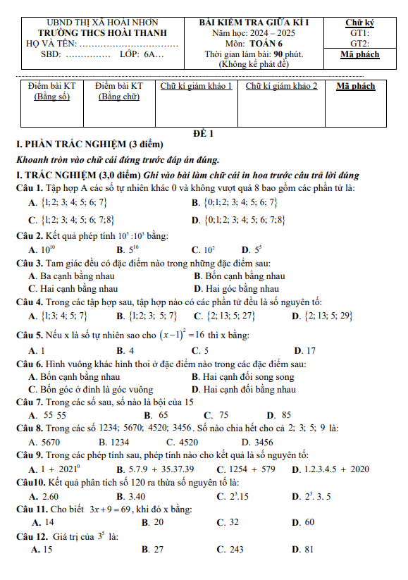 Đề giữa học kì 1 Toán 6 năm 2024 – 2025 trường THCS Hoài Thanh – Bình Định