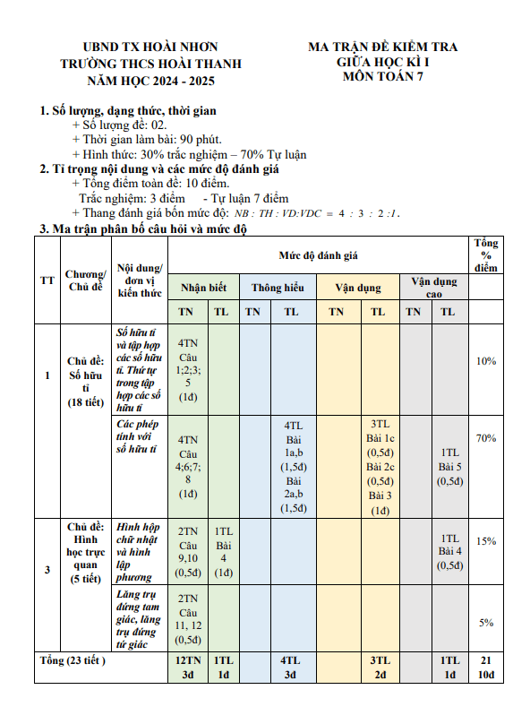 Đề giữa học kì 1 Toán 7 năm 2024 – 2025 trường THCS Hoài Thanh – Bình Định