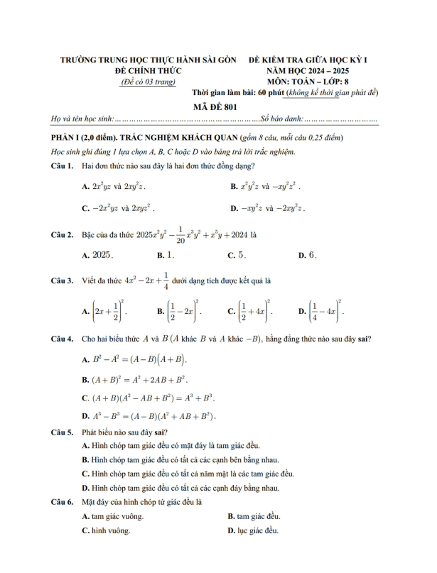 Đề giữa học kỳ 1 Toán 8 năm 2024 – 2025 trường Thực hành Sài Gòn – TP HCM