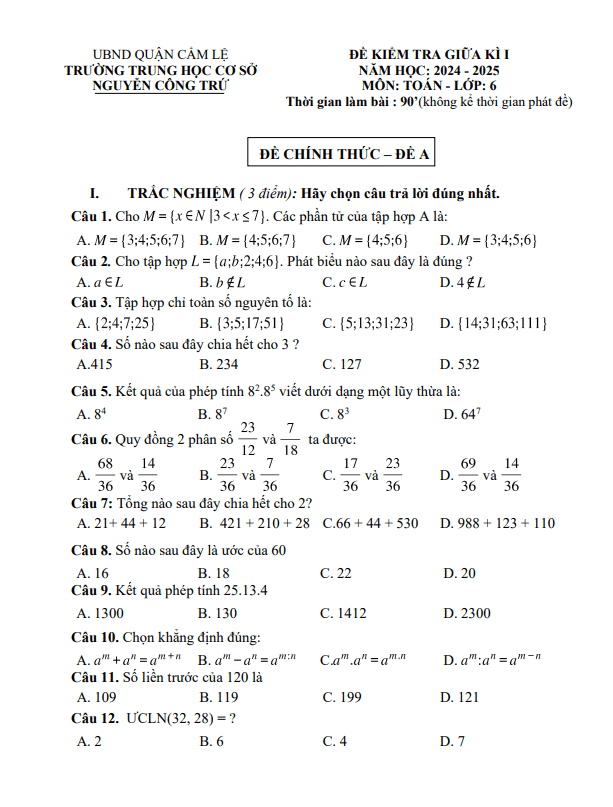 Đề giữa kì 1 Toán 6 năm 2024 – 2025 trường THCS Nguyễn Công Trứ – Đà Nẵng