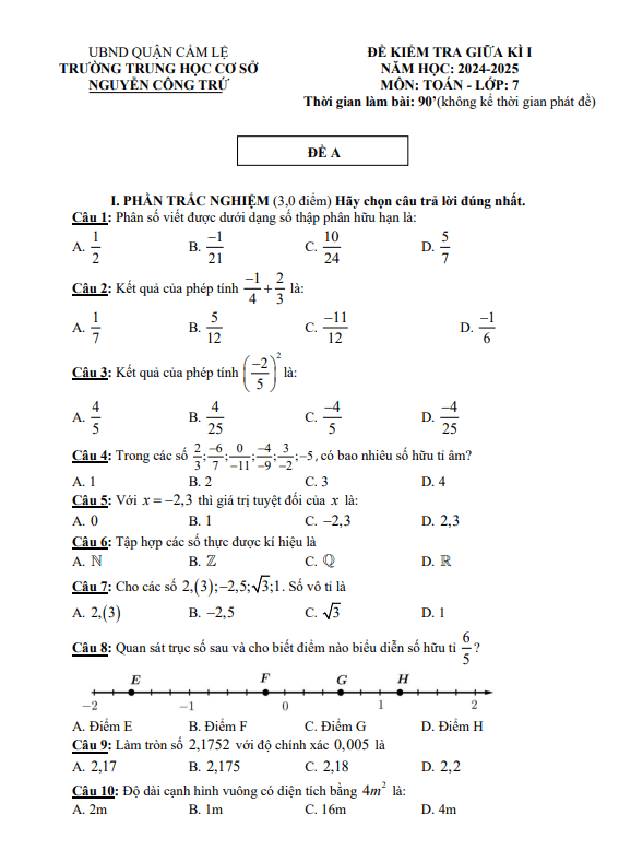 Đề giữa kì 1 Toán 7 năm 2024 – 2025 trường THCS Nguyễn Công Trứ – Đà Nẵng