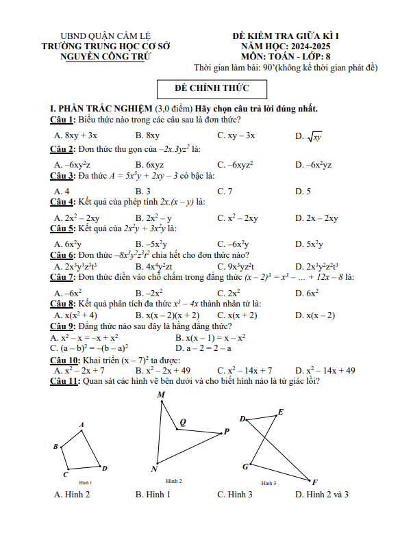 Đề giữa kì 1 Toán 8 năm 2024 – 2025 trường THCS Nguyễn Công Trứ – Đà Nẵng