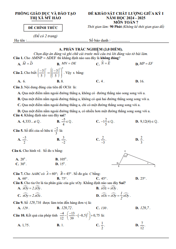 Đề giữa kỳ 1 Toán 7 năm 2024 – 2025 phòng GD&ĐT Mỹ Hào – Hưng Yên