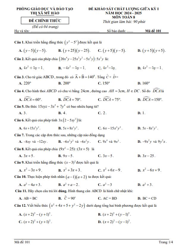 Đề giữa kỳ 1 Toán 8 năm 2024 – 2025 phòng GD&ĐT Mỹ Hào – Hưng Yên