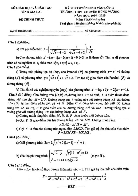 Đề thi vào lớp 10 môn Toán (chuyên) năm 2024 – 2025 trường chuyên Hùng Vương – Gia Lai
