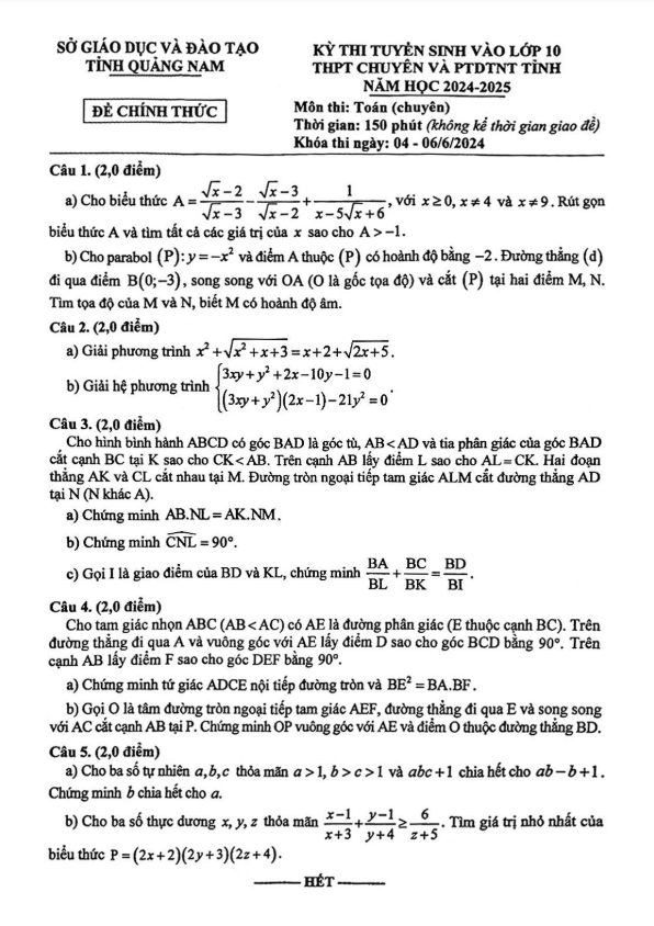 Đề tuyển sinh lớp 10 chuyên môn Toán (chuyên) năm 2024 – 2025 sở GD&ĐT Quảng Nam