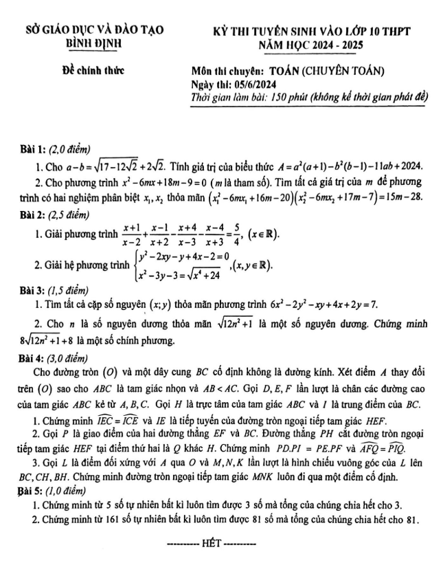 Đề tuyển sinh lớp 10 môn Toán (chuyên) năm 2024 – 2025 sở GD&ĐT Bình Định