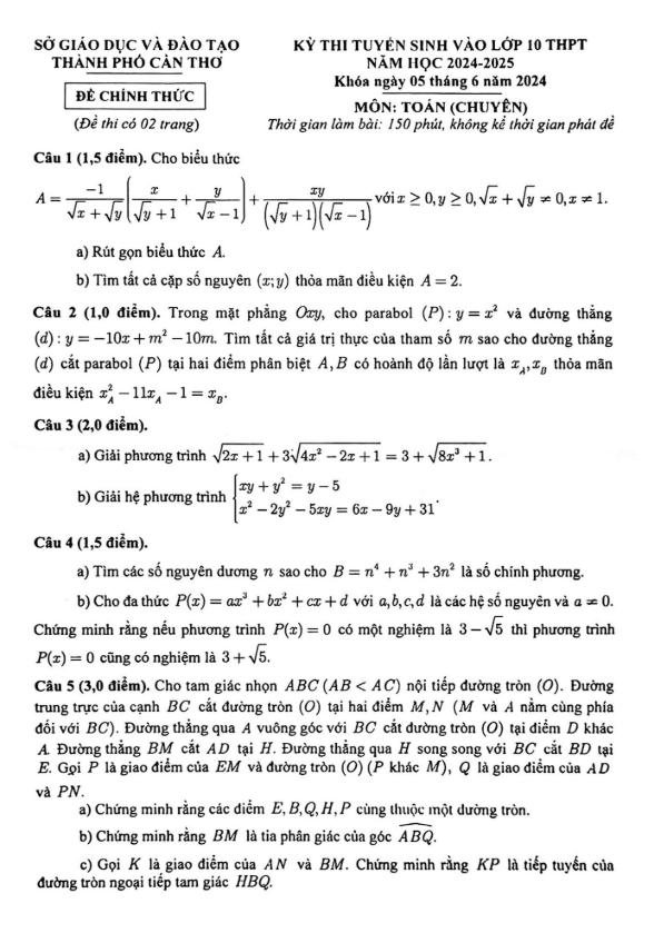 Đề tuyển sinh lớp 10 môn Toán (chuyên) năm 2024 – 2025 sở GD&ĐT Cần Thơ